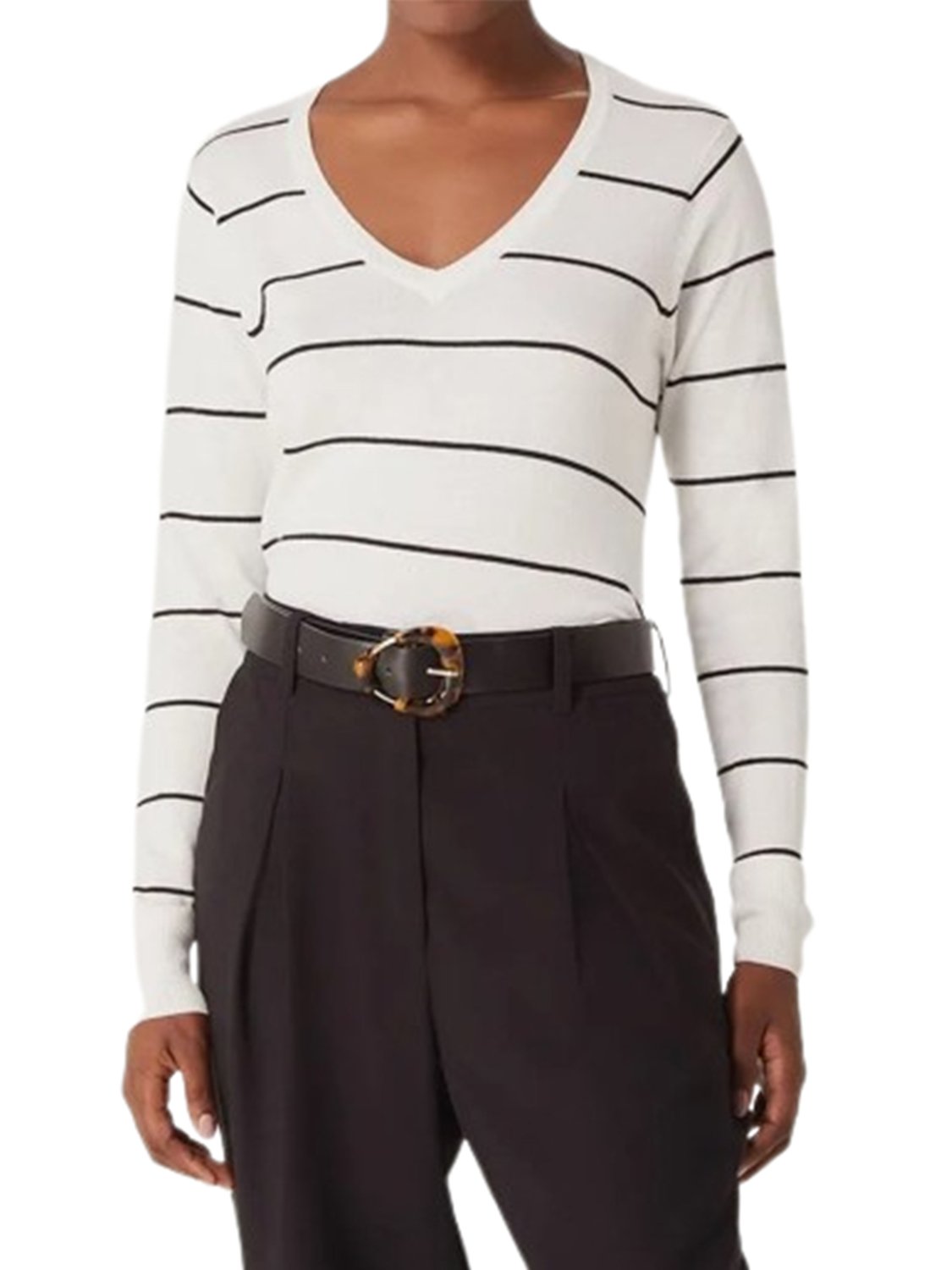 O Blusão Básico Feminino Decote V é confeccionado em tricô de fio tinto, com algodão e poliamida, oferecendo conforto, leveza e um toque macio. Sua padronagem listrada e modelagem slim garantem um caimento ajustado ao corpo, proporcionando um visual moderno e versátil. Ideal para compor looks casuais ou sofisticados, é uma peça essencial que combina com diversas produções.