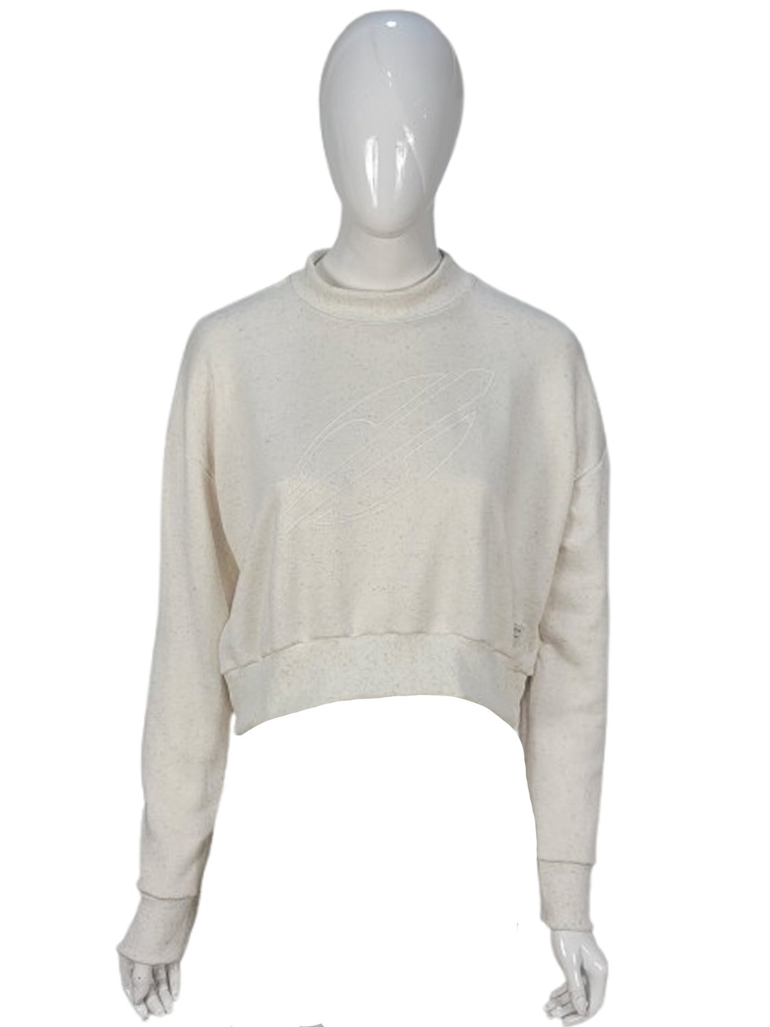 Blusão de Moletom Poli-linho, feminino Mormaii 76177. Confeccionado em poliéster , algodão e linho. Apresenta modelagem cropped ,manga longa,logomarca mormaii estampado na frente, gola redonda, punhos, barra e gola em ribana. Moletom super confortável e macio, com aspecto mesclado devido ao linho.