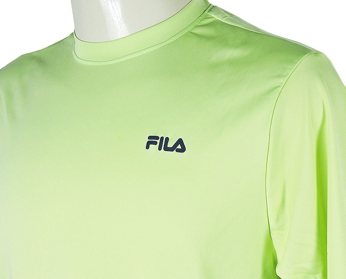 Camiseta confeccionada em malha de poliéster com elastano, modelagem regular, com gola em ribana de poliéster e possui aplicação letter da marca Fila na frente.