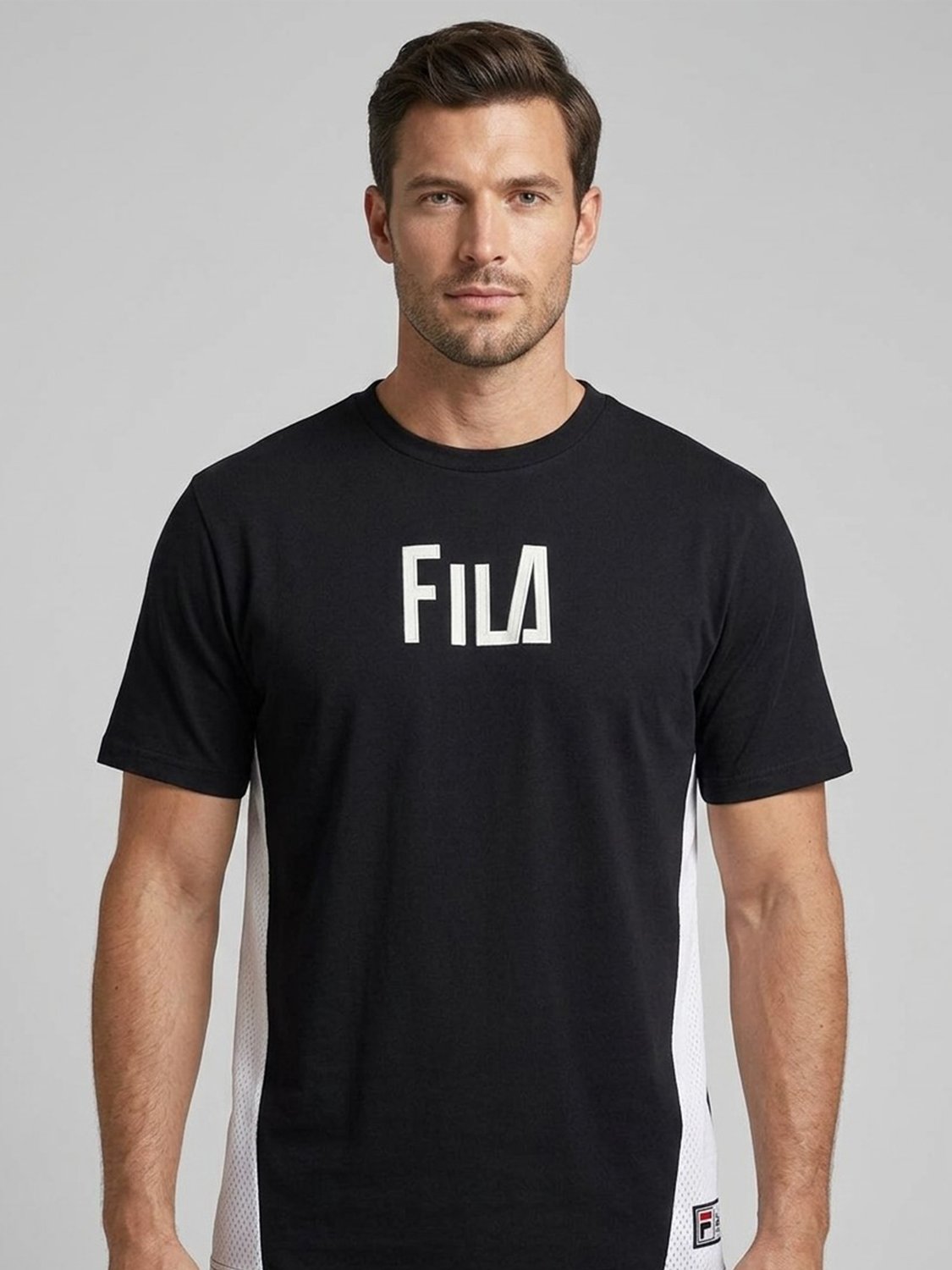 Camiseta masculina confeccionada em mix de tecidos com meia malha premium de algodão e recortes laterais em malha telada. Modelagem oversized com manga curta e gola careca em ribana. Possui cavas, ombros, barra e gola com acabamento pespontado, recorte lateral contrastante, estampa frontal Fila Letter Street Hop em silk sustentável e etiqueta Fila Street Hop aplicada na lateral esquerda próxima à barra.