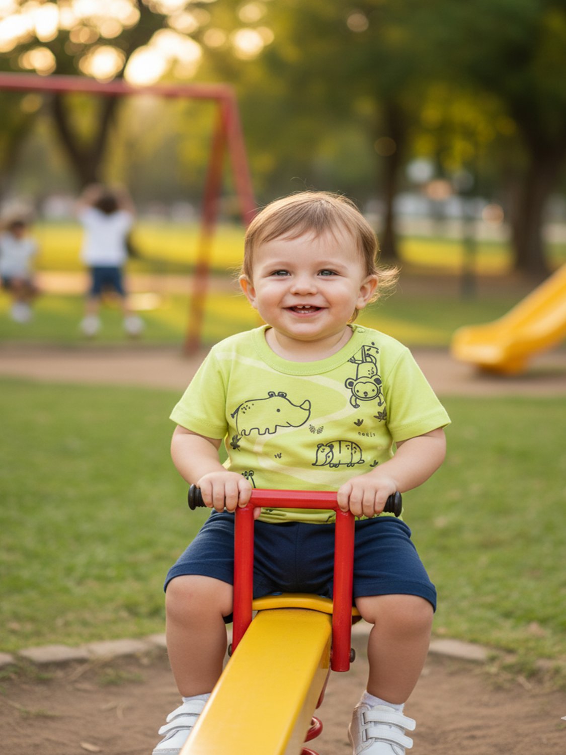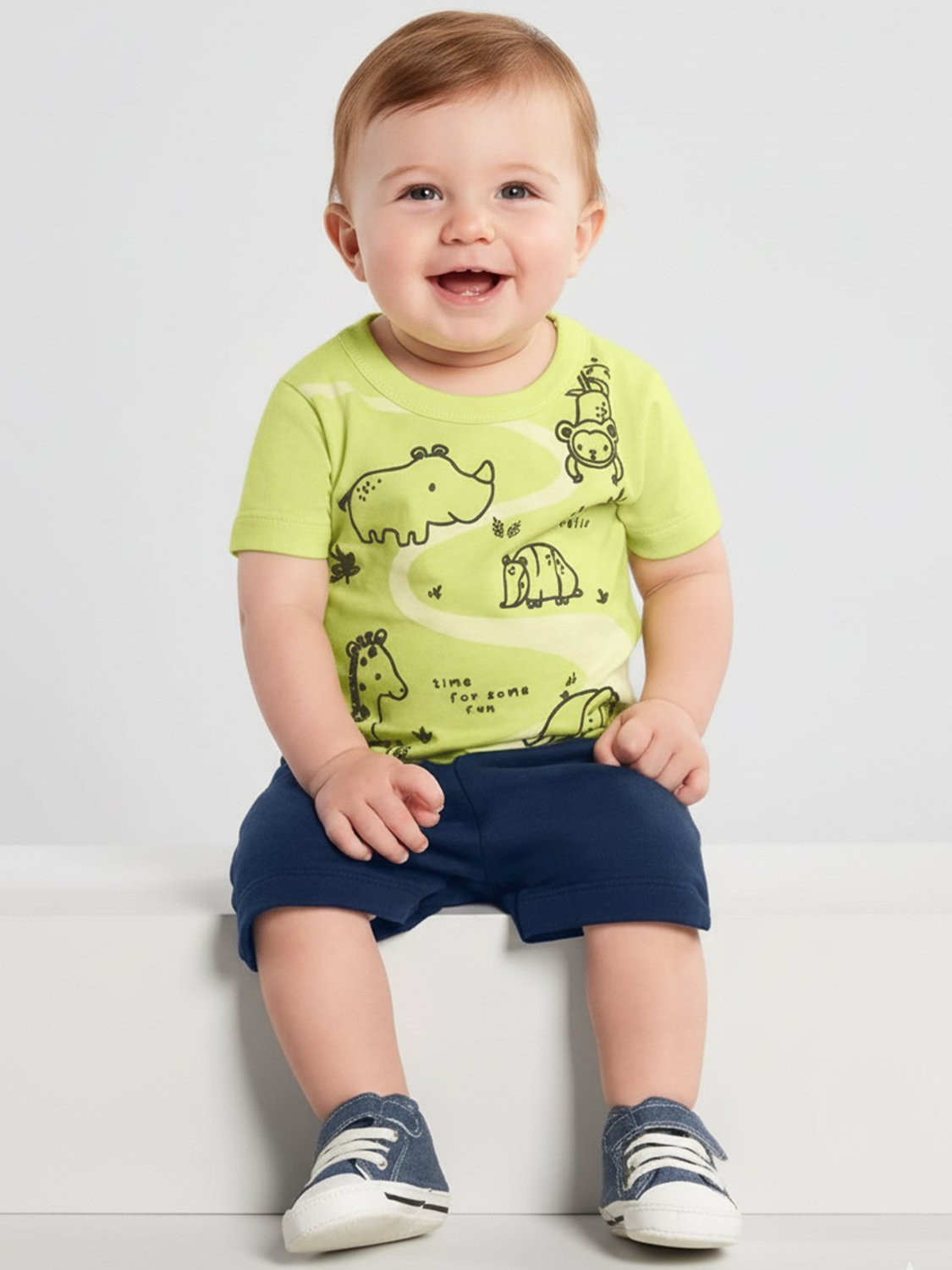 Deixe seu pequeno estiloso e confortável com o conjunto bebê menino da Brandili! Composto por uma camiseta em meia malha, traz uma divertida estampa em puff de bichinhos, cheia de charme e alegria. Acompanhando a camiseta, a bermuda em moletinho com cós elástico proporciona conforto e liberdade de movimento, ideal para as aventuras do dia a dia. Perfeito para os momentos de brincadeira, esse conjunto é a escolha ideal para manter seu bebê fashion e à vontade. Combine com tênis para um look moderno e cheio de estilo