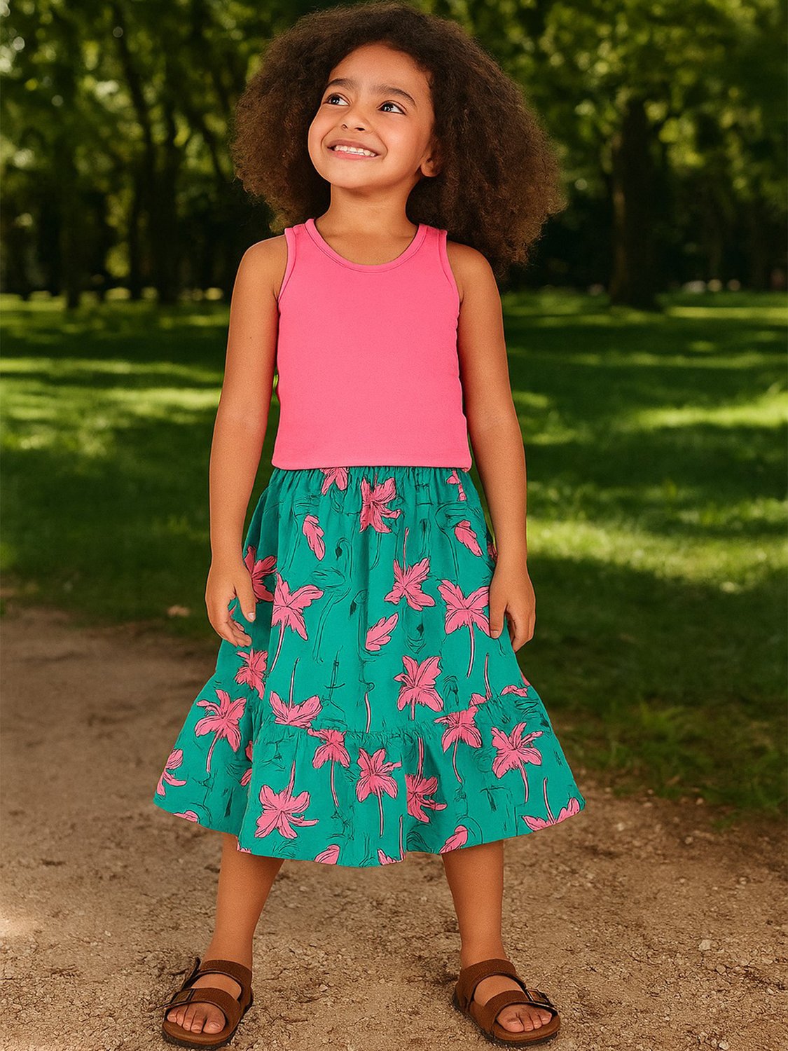 O Conjunto Infantil Menina Kyly Flamingos 1001046 , traz todo o charme do clima tropical aliado à liberdade da infância. Pensado para oferecer conforto e estilo nos dias mais quentes, o look combina uma regata cropped moderna com uma saia midi fluida e estampada, criando uma composição alegre e encantadora.