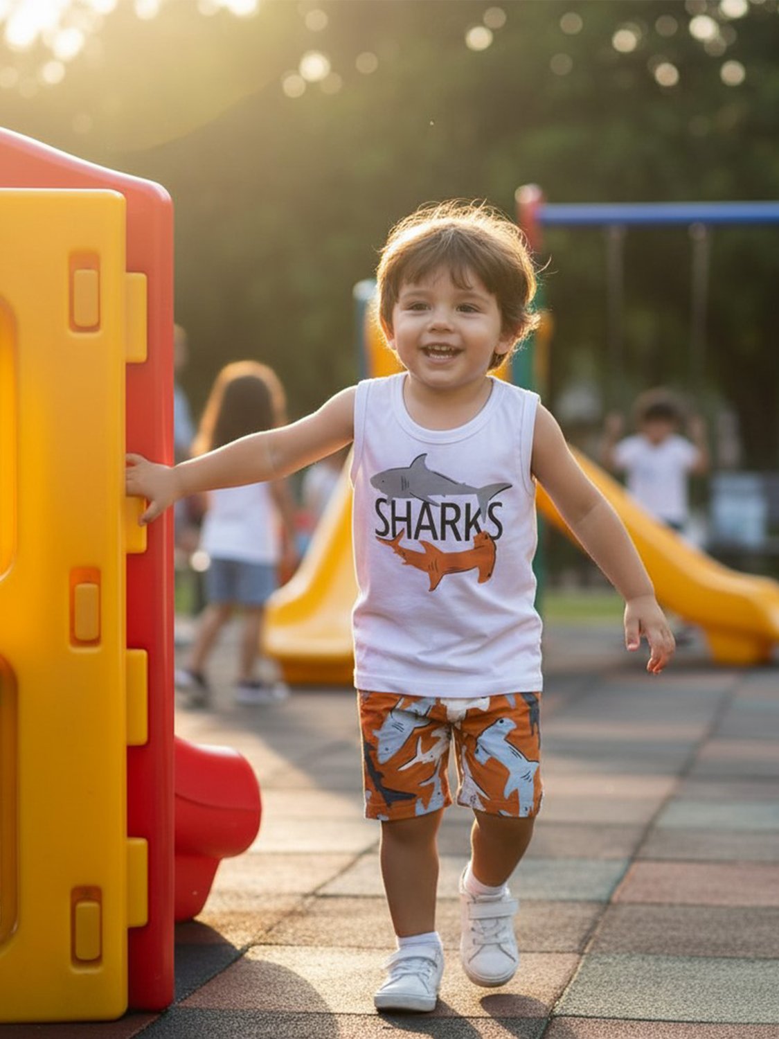 A bermuda, feita em moletom sem felpa 100% algodão, apresenta uma estampa rotativa de tubarões estilizados, cheia de movimento e autenticidade. Seu cós elástico garante ajuste perfeito e liberdade, acompanhando os pequenos em todas as brincadeiras do dia.