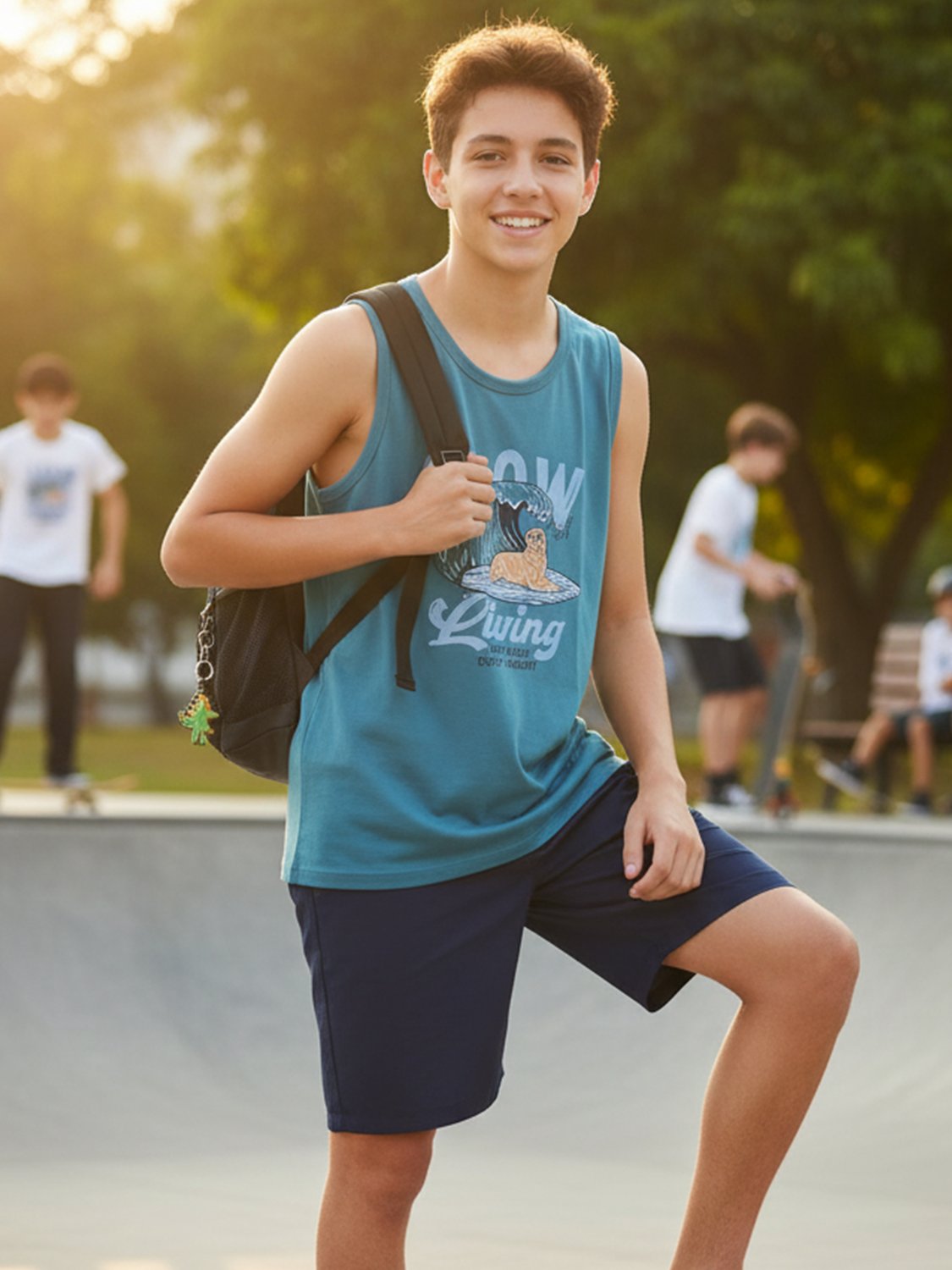 - Regata: Modelagem levemente ajustada, decote redondo, estampa divertida