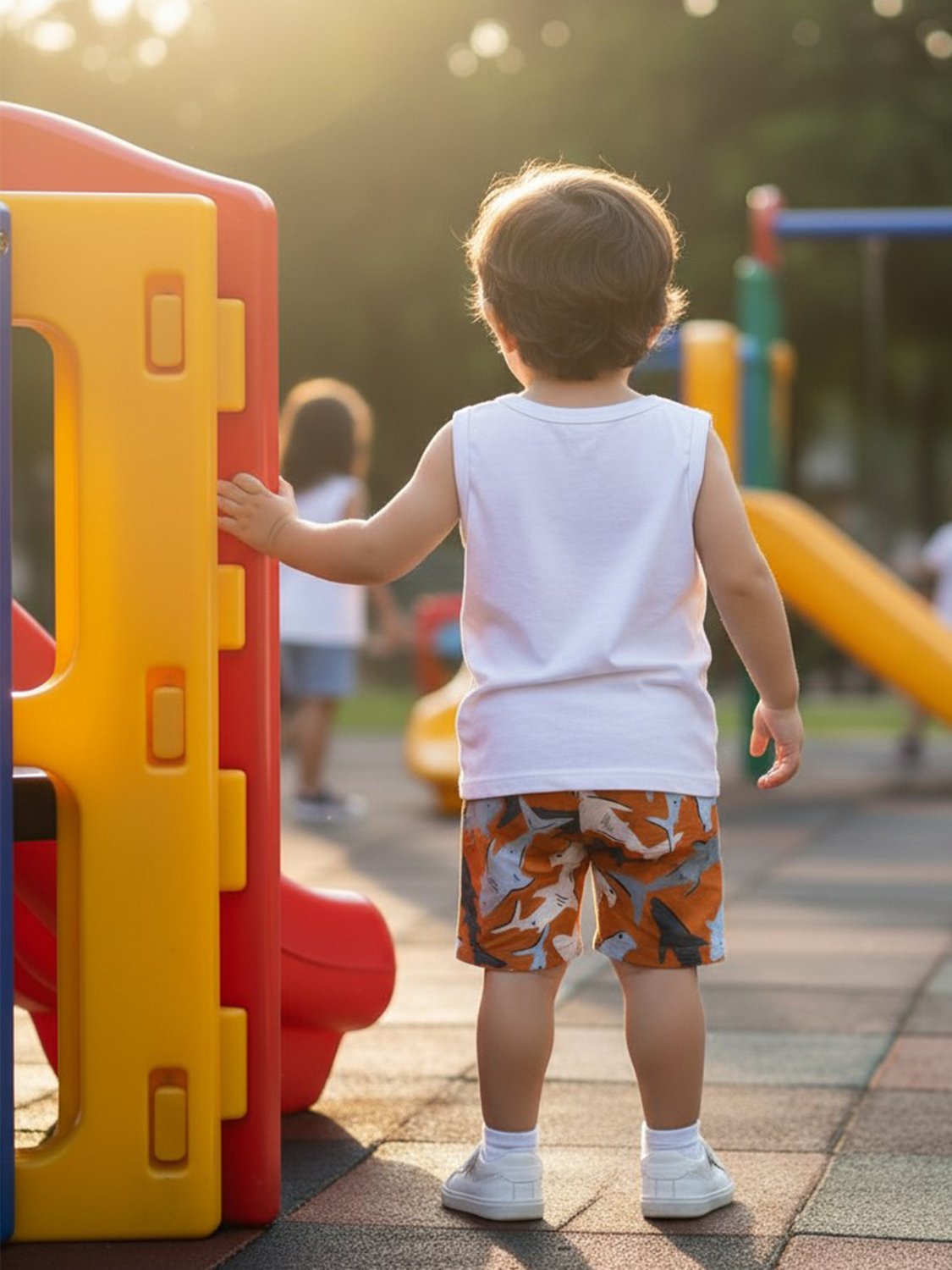A bermuda, feita em moletom sem felpa 100% algodão, apresenta uma estampa rotativa de tubarões estilizados, cheia de movimento e autenticidade. Seu cós elástico garante ajuste perfeito e liberdade, acompanhando os pequenos em todas as brincadeiras do dia.