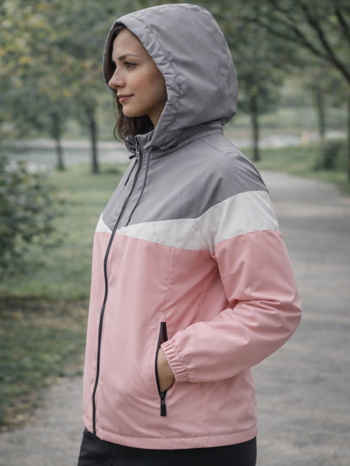 O capuz removível com cordão para ajuste oferece adaptação conforme a necessidade, enquanto os bolsos frontais com zíper garantem segurança para pequenos objetos. O acabamento com punhos em elástico e barra ajustável proporciona melhor caimento ao corpo.