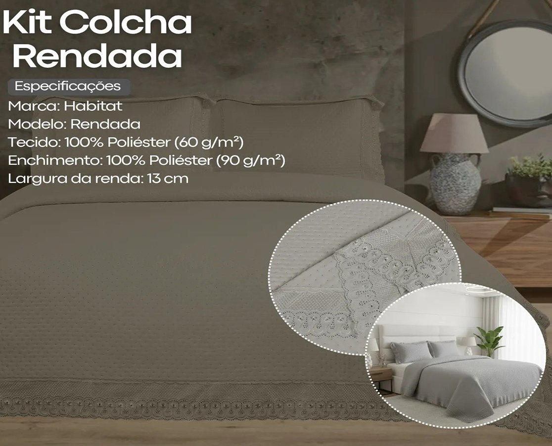 Kit Colcha Casal 2,20x2,40 Flora Renda Habitat Cinza