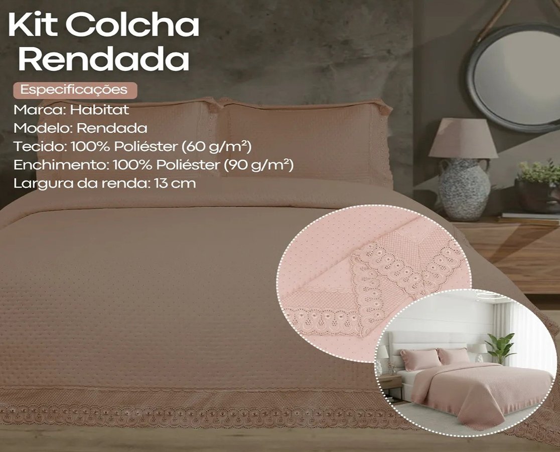 A Colcha Casal Flora Renda Habitat combina funcionalidade, conforto e um visual sofisticado, sendo perfeita para quem valoriza detalhes e deseja um quarto elegante e acolhedor todos os dias.
