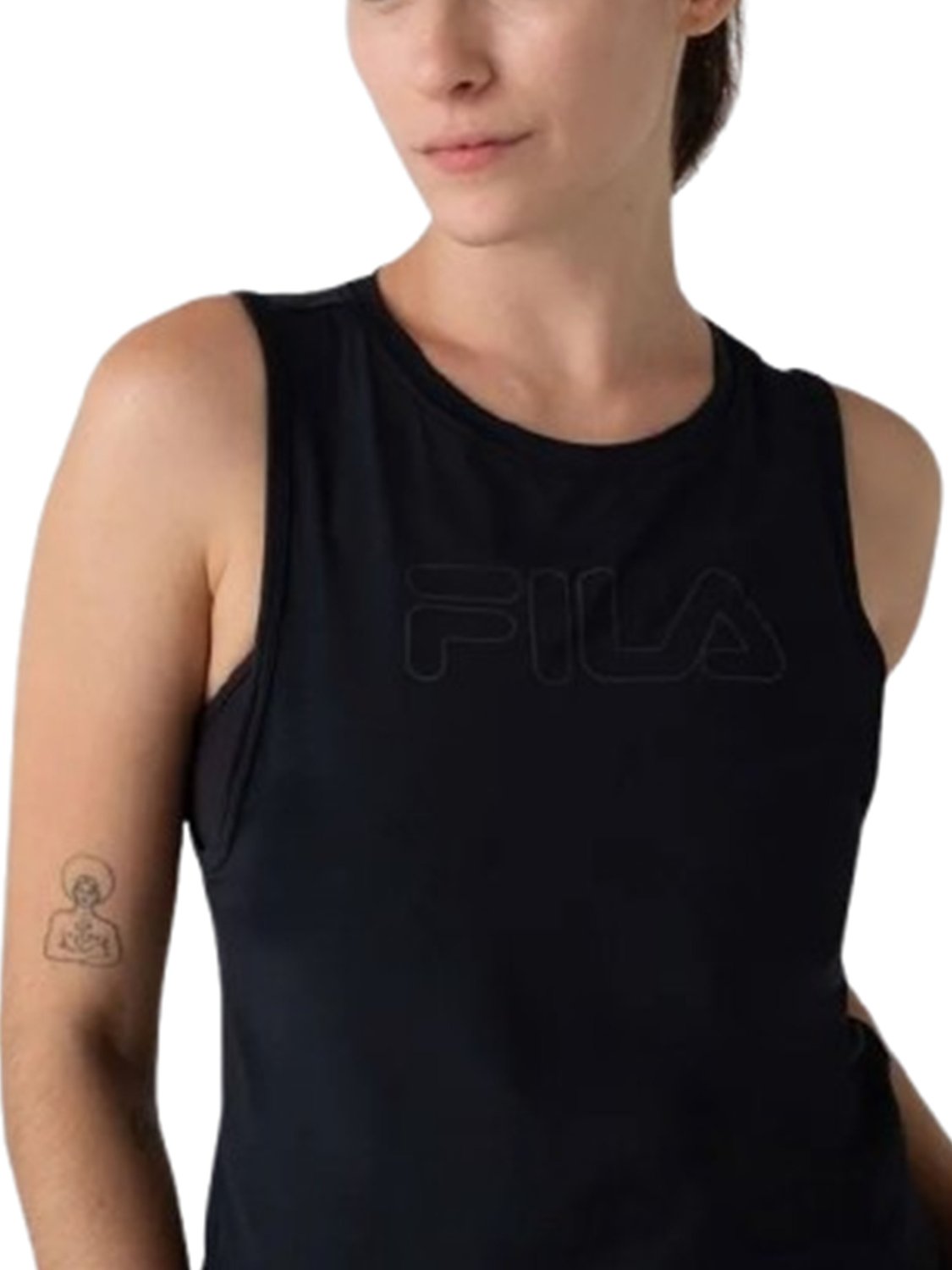 Regata feminina confeccionada em malha com toque fresco de poliamida e elastano. Modelagem regular com gola careca. Seu tecido leve contém as tecnologias FLOW, que proporciona conforto e rápida secagem; a UV PROTECTION, que oferece proteção solar FPS 50+ dos raios UVA e UVB; e a BREEZE, desenvolvida com fio especial capaz de reduzir em 1,5ºC a temperatura corporal. Possui costuras sem atrito com o corpo, cavas mais abertas com acabamento pespontado e estampa Fila Letter Outline centralizada na parte frontal.