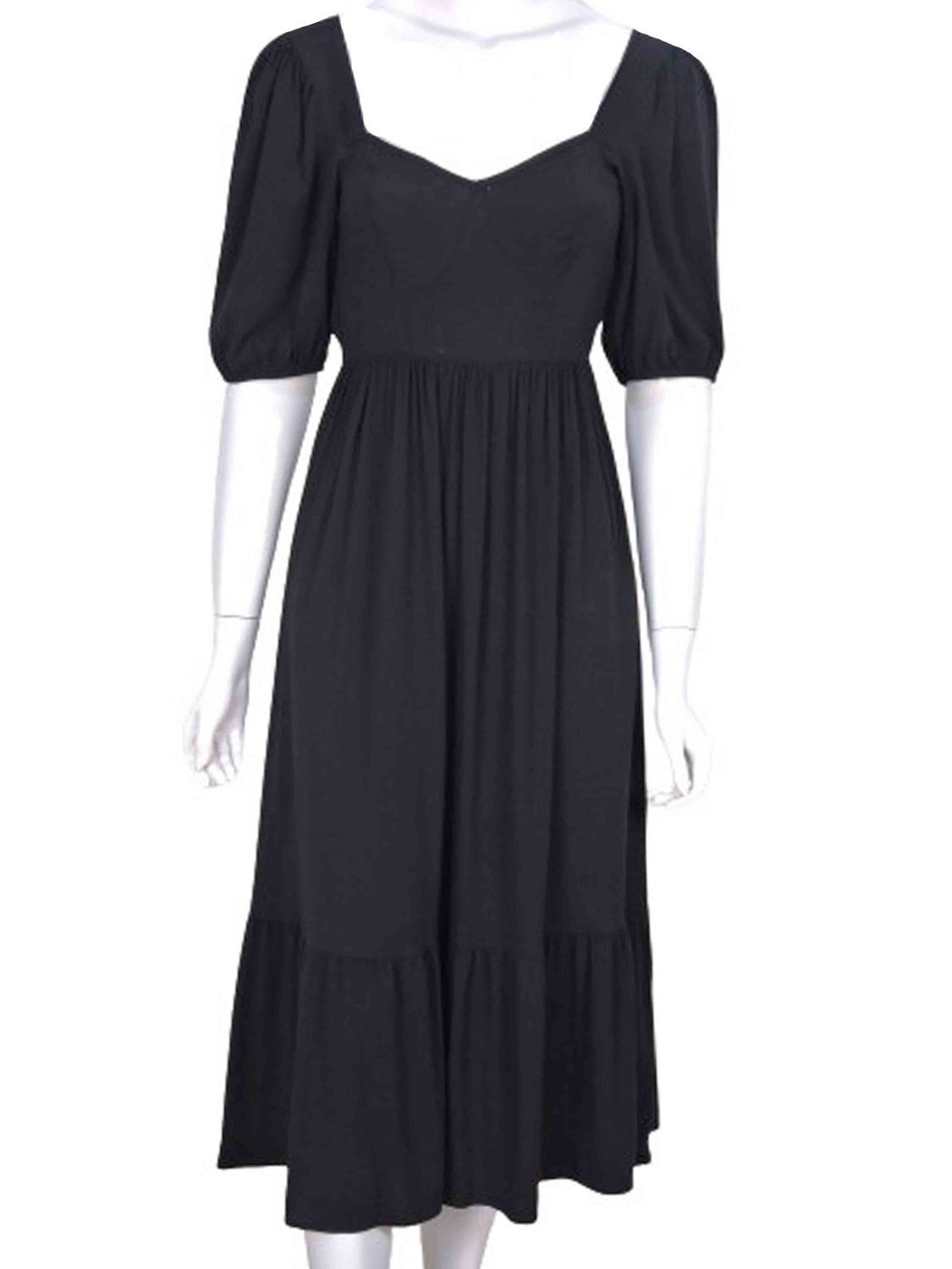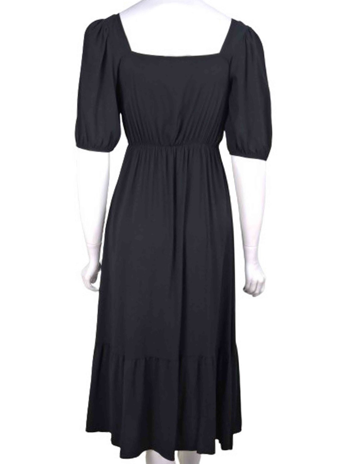 Vestido Midi Feminino confeccionado em viscose e elastano. A peça apresenta modelagem midi, mangas ¾ e bufantes, decote quadrado com recorte na parte frontal, elástico na cintura para melhor ajuste e saia com babado. É um item ideal para você montar um look básico e sofisticado.