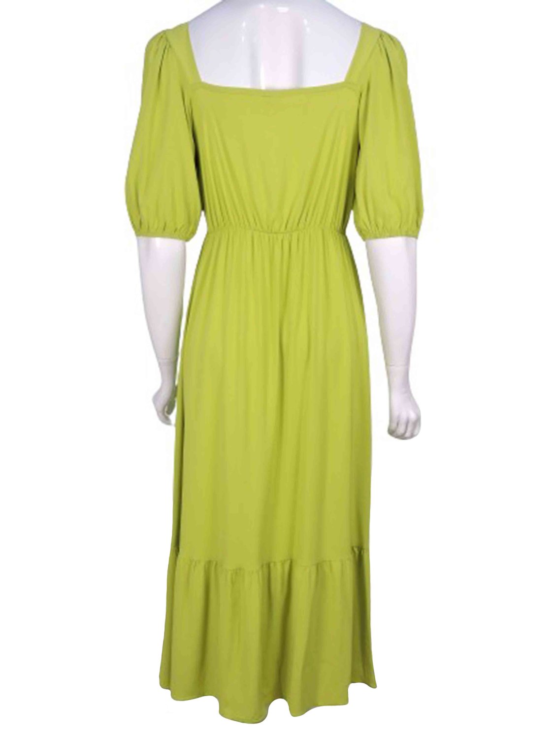 Vestido Midi Feminino confeccionado em viscose e elastano. A peça apresenta modelagem midi, mangas ¾ e bufantes, decote quadrado com recorte na parte frontal, elástico na cintura para melhor ajuste e saia com babado. É um item ideal para você montar um look básico e sofisticado.